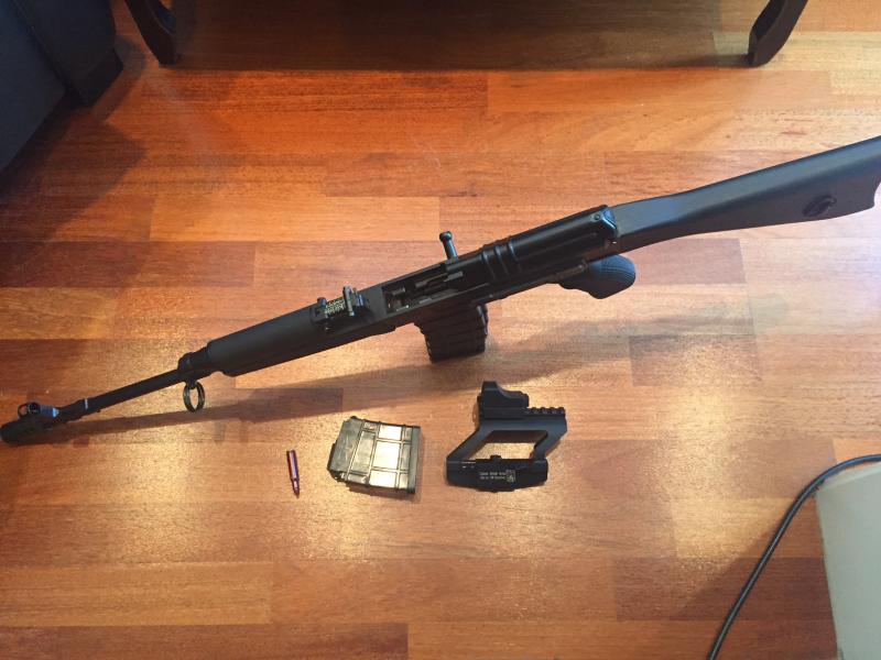 Se vende el mencionado fusil en un estado 10 con dos cargadores, uno transparente de 10 limitado y otro opaco de 30 para uso de colección, bocacha apagallamas, base original para punto rojo, punto rojo compacto como se aprecia en las fotos, accesorio para correa de un punto, dicha correa y soporte para pistolete delantero con pistolete retraible.