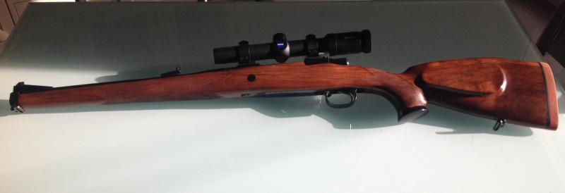 Hola, vendo rifle alemán de rastro Mauser 98 Stutzen, calibre 9,3x62. Muy corto y manejable, cañón de 42 cm y longitud total de 95 cm. Culata nueva de nogal de buena calidad con encamado de resina. Seguro lateral para montaje de visor bajo. Monturas Warne. Visor Zeiss Classic 1.1-4x24. Está en Madrid.