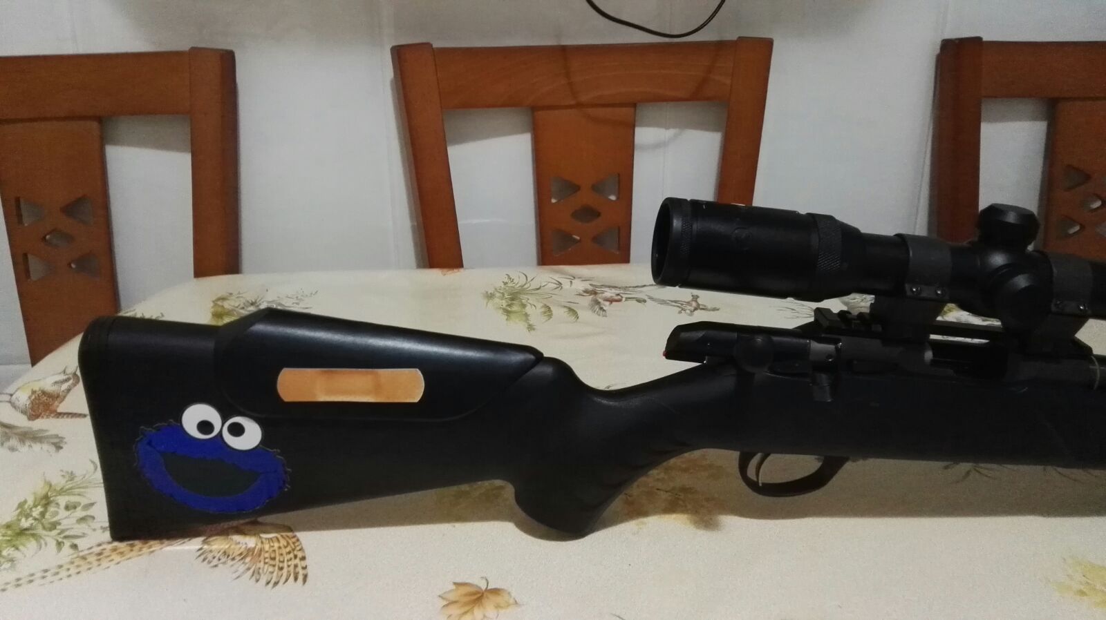 hola, me comentan que la carabina tiene un par de años, las pegatinas salen perfectamente si le aplicas un poco de calor con un secador de pelo , tendra mas o menos 1500 disparos agrupa excelente si tienes alguna duda mas llama sin ningun compromiso
