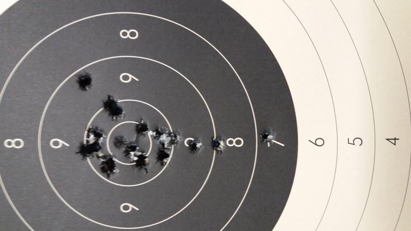 La diana esta a 50 metros y estoy esperando que venga sol para poder tirar mejor. Las miras son muy finas y están bastante cerca del ojo lo que me complica un poco el tiro. El rifle es mas corto que los Gustaf pero si tienes las miras claras entran todos. Problemas de la edad.