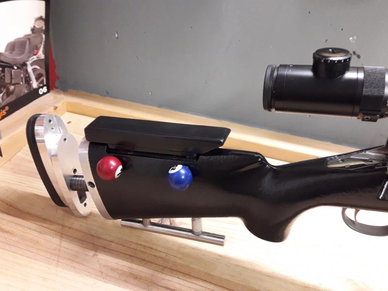 Tiene acción y culata remington, tiene hecho el encame de resina con pilares de aluminio, puesto una cantonera y carrillera ajustables y una barra de aluminio para el deslizamiento sobre el saquete.
