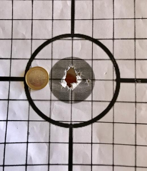 Casete gatillo recto de 3 lb y una diana a 50 mts, cada cuadricula mide 10 mm de lado, con el arma en caballete.