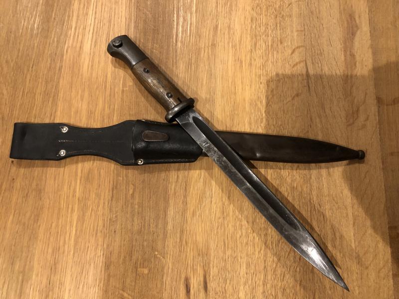 Y de la bayoneta alemana de la II GM, con su funda y tahalí originales, que prefiero no tener que vender por separado, ya que encajan como anillo al dedo.