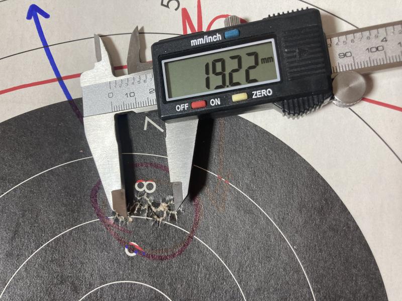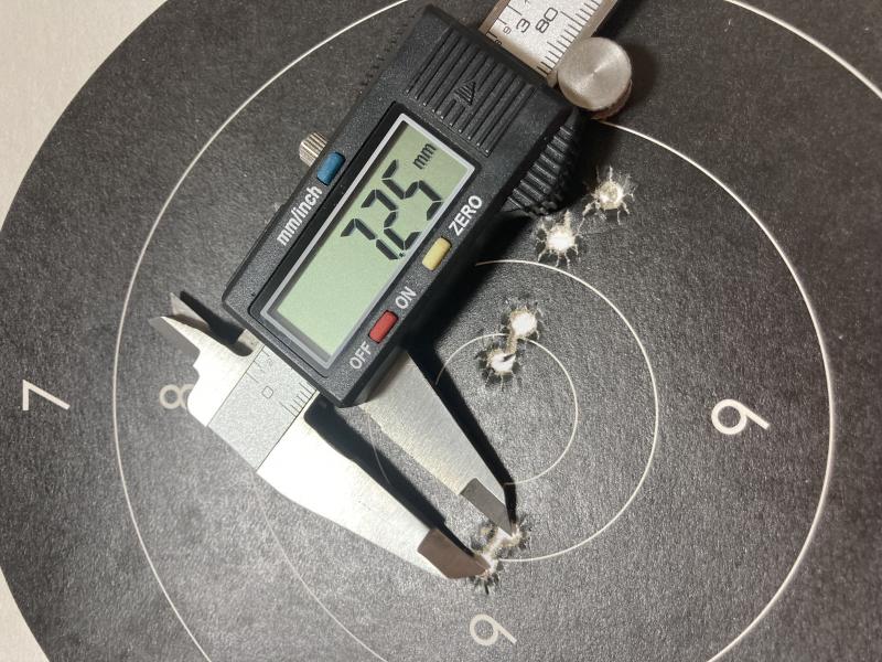 o que agrupe dos tiros seguidos separados por 7,25 mm (y no fue casualidad, en la foto se pueden apreciar las tres tandas de dos tiros que tiré para ajustar la deriva)
