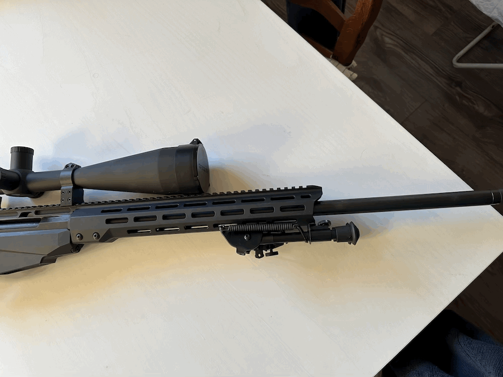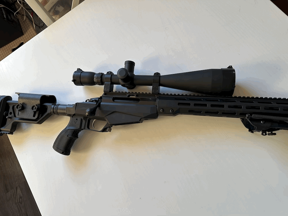 Equipado con mira sightron 10-50x60, monturas 30mm fijas, bipode y adaptador harris.