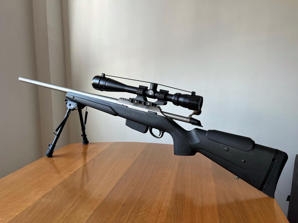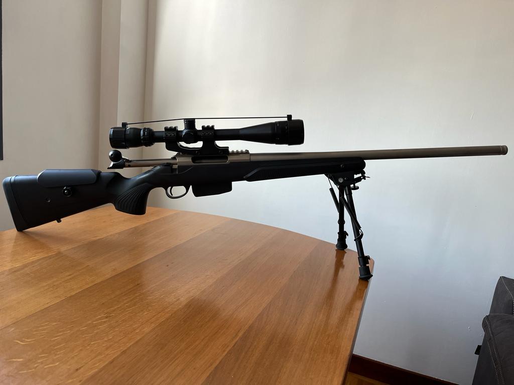 Cañon pesado con rosca inox, cuerpo de polimero.Lo vendo con los siguientes extras: visor Busnhell Banner 6-24x40, bipode cobra, anillas y funda original Tikka.