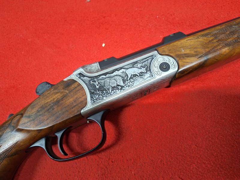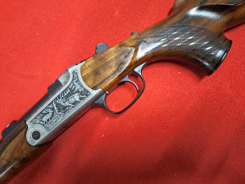 Rifle BLASER K95 LUXUS, calibre 270, maderas grado 4 de nogal, grabados de rebecos y ciervos. Muy poco uso, unos 10 recechos de rebeco. Presenta mínimas marcas de uso en la madera.