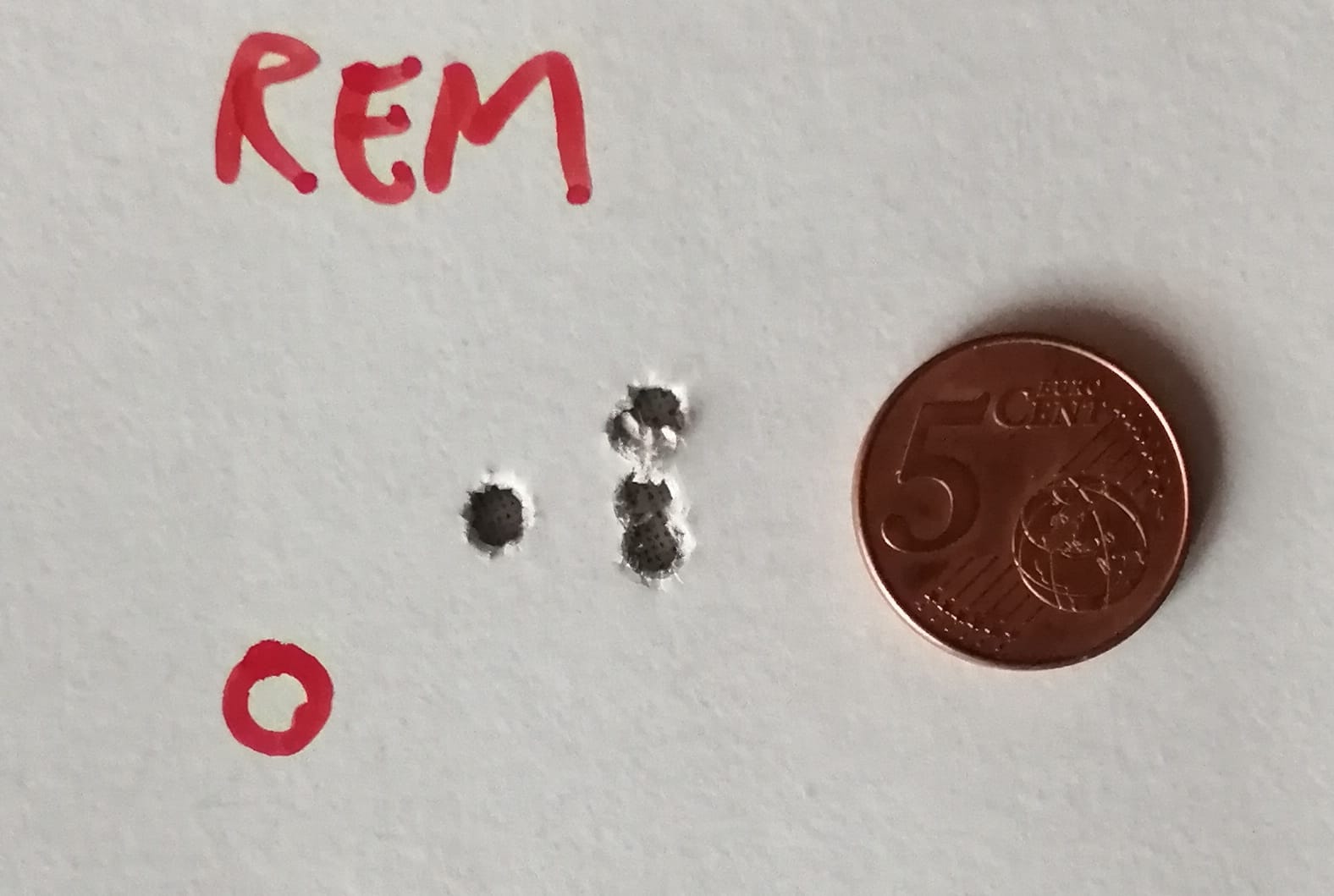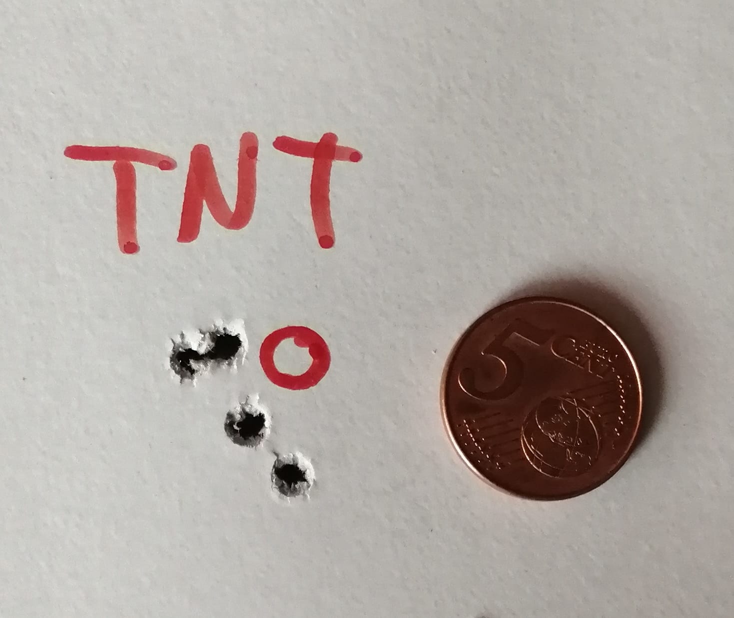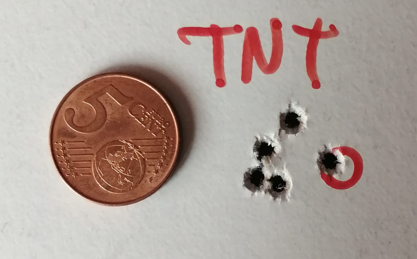 Unas agrupaciones, están hechas con CCI TNT 17gr (actualmente las más baratas del mercado), 5 disparos a cincuenta metros apoyando el bípode en la mesa y el hombro detrás (sin más apoyos), con el visor a seis aumentos. Con mejor apoyo y/o mas aumentos seguro que mejora, pero esto es lo que soy capaz de sacar con el equipo que ofrezco.