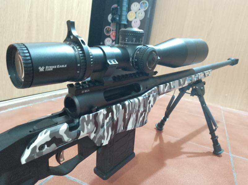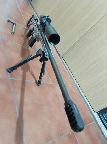 Lleva un visor Vortex Strike Eagle 5/25 en MRAD, con anillas Leupold, bípode Harris (no basculante) y freno de boca.