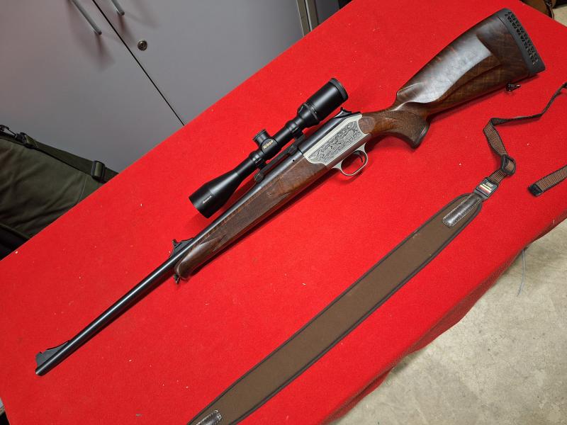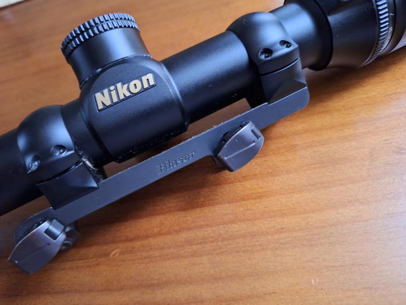 Rifle BLASER R93 LUXUS, cal. 30/06 + monturas Blaser de 1" con visor Nikon Monarch 2,5 -10x 42. El rifle tiene algunas marcas en la madera , propias del uso. Maderas preciosas. El visor va muy bien tiene mucha claridad y retícula de compensación de caída. Correa Niggeloh.