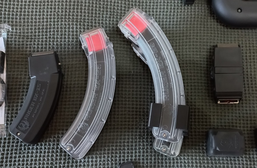 Se alimenta mediante los cargadores estándar de la Ruger 10/22, en este caso el acceso del cargador se encuentra en la parte delantera de la culata, y justo detrás de la empuñadura trasera circular.