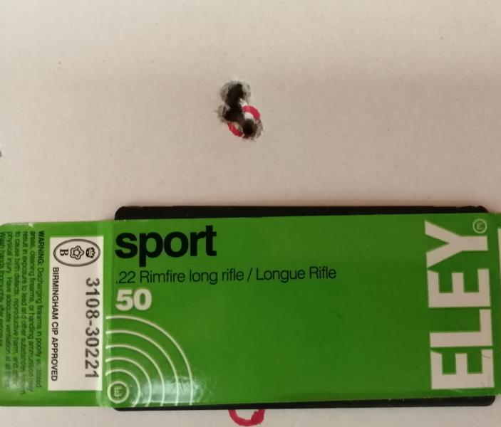 También una foto de agrupación, 5 disparos a 50m con munición eley básica, tirando como se ve en la foto, con saco perrero delante y la mano detrás (en principio solo pensaba sacar fotos y no tenía la torreta en el club)con buena torreta y special match, era todo mono agujeros.
