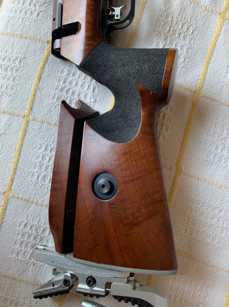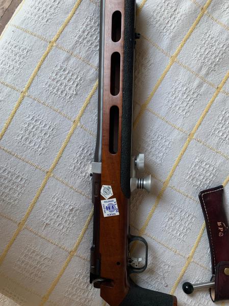 Es un estándar grueso calibre en 6mmBR Norma con disparador Anschutz de competición (de 1 a 10 oz, creo) con todas las regulaciones posibles. Culata de madera de nogal también regulable. Diópter e iris G&E con montura original, aunque en realidad es un Anschutz también pero vendido por Gruenel. Incluyo un túnel largo de Anschutz-Gehmann-Centra con doble retícula y nivel, tope de mano MEC, Bípode de descanso MEC y correa de competición Anschutz sin usar. Tiene de serie los taladros para instalar monturas Apel si se le quiere poner visor telescópico. La rabera es también de G&E, una de las de más alta gama de este fabricante que permite la configuración que se desee de forma fácil y completa.