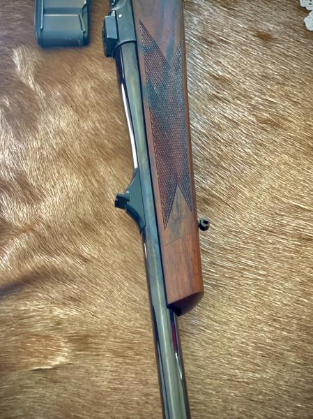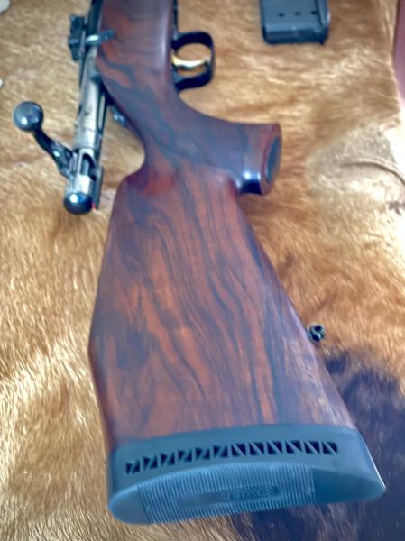 Maderas grado 5 nogal turco. Gatillo dorado con pelo francés. Cargador extraible, miras abiertas, cañón 65cm, cerrojo muy suave gracias a sus tetones escamoteables. Bases y anillas apell de 30mm. Anillas portafusil “ quita y pon” y correa de neopreno. Baleo perfecto.
