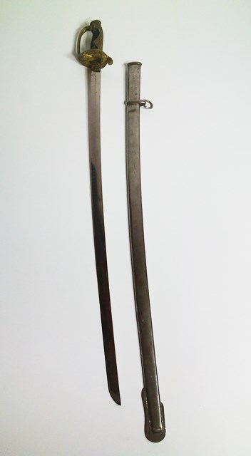 Este que vendo es un Kyu-gunto para oficial de infantería de clara fabricación industrial; Lleva montura en latón con crisantemos en sendos laterales y uno en la parte superior. Empuñadura en metal lacado, con algunas faltas, torzal de latón y sin fiador. Hoja de metal cromado de 75 cm de longitud con lomo cuadrado y aguas en el filo. Vaina de aspecto sólido, en metal cromado, con una anilla de sujeción. Está en buen estado general, el cuero que hace de tope en la bigotera no está pero es fácilmente restaurable, leve movimiento en parte inferior de la guarda.