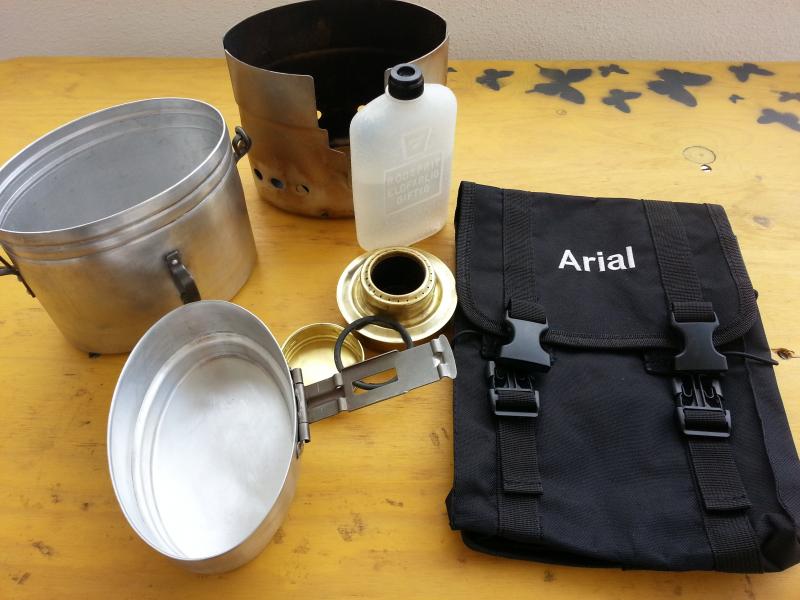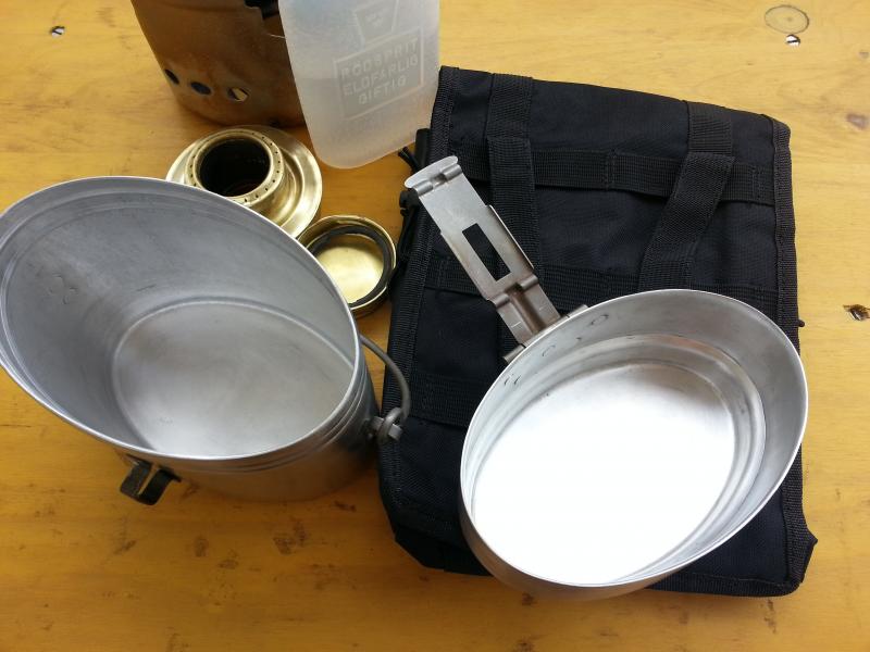 Vendo conjunto de hornillo de alcohol original Trangia con su paraviento, y marmita de alumino compuesta de 2 piezas, ademas de bote para contener el alcohol y una funda molle en la que entra el conjunto y queda un espacio extra para meter algo de comida.