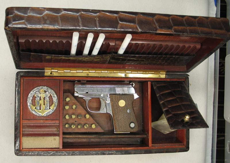 Exterior de símil piel de cocodrilo e interior de caoba. Perteneció a un militar de la Armada. Fecha aproximada: década de 1920. Es también caja de música a cuerda que funciona perfectamente. Esta empieza a funcionar cuando se abre el estuche a modo de alarma. Al cerrarla, la música cesa de sonar.