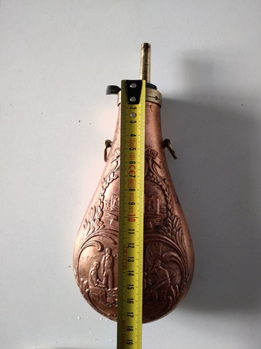 Polvorera fabricada a mediados de los 60 muy bien conservada, de buena calidad realizada con piezas de bronce y cobre con boquilla de medidor de cargas en buen estado y asas de bronce para colocar correa y colgar, sus caras están decoradas con trabajados en relieve de la batalla de san Jacinto 1836 la lucha de independencia de Texas. Sin contar la boquilla mide 17, 5 cm de largo * 9 cm de ancho. Precio 35€ con envio en penindula.