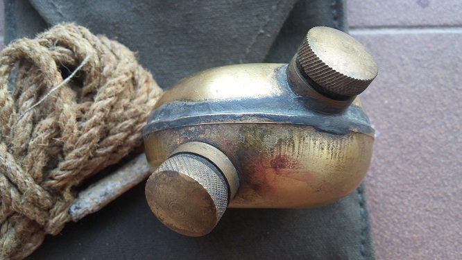 kit de limpieza con feminela, cuerda, protector de boca de fuego y aceitera doble en muy buen estado con alguna pequeña abolladura.