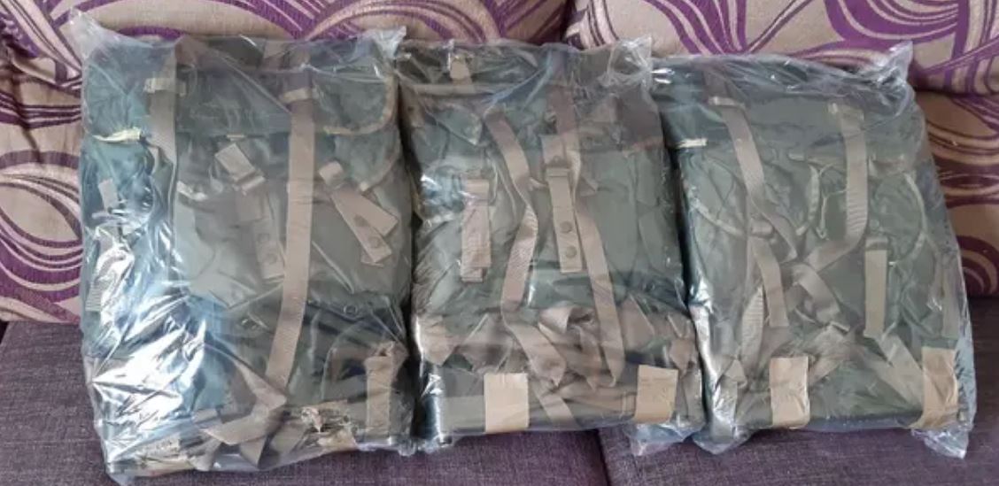 Mochila de combate modelo M-86, similar a la estadounidense ALICE tipo Medium, fabricada en nylon de color verde y montadas sobre un armazón de aluminio.
