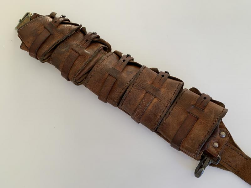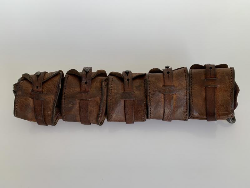 Vendo bandolera 5-bolsillos de cuero para llevar peines de munición del Mauser sueco: M/94, M/96, M/38 y M/41. En buen estado, con una hermosa patina solo posible con el paso de los años. Muy antigua, periodo primera mitad siglo XX. *VENDIDO*