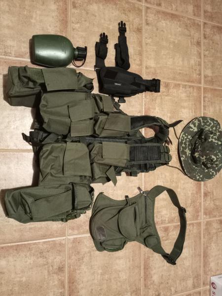 Lote Chaleco sudafricano pattern 83 Sadf del fabricante MILTEC con funda pernera de pistola, chambergo ,cantimplora original del BW y bolso pernera.