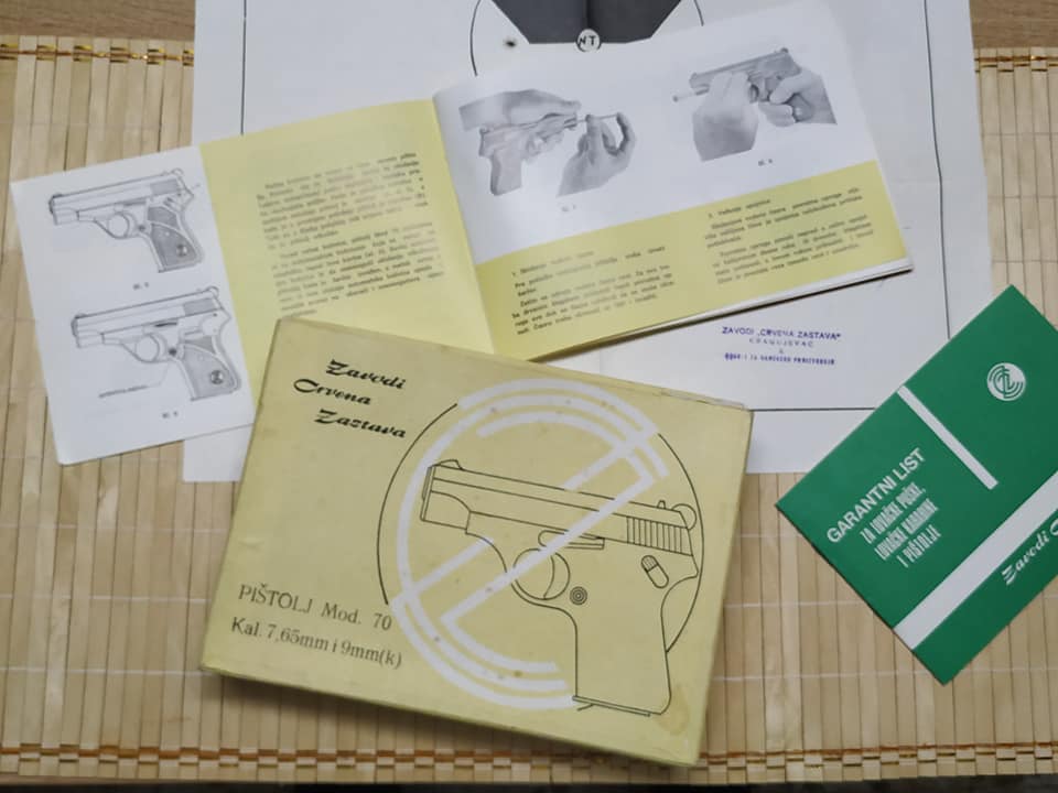 Escasísima (al menos en España) caja original de la pistola yugoslava Zastava Mod 70 de calibre 7,65 o 9mm corto producida en la localidad serbia de Kragujevac, la caja está en buen estado y le acompaña el manual de instrucciones, la garantía del arma y un blanco del banco de pruebas de la fábrica fechado en diciembre de 1974.
