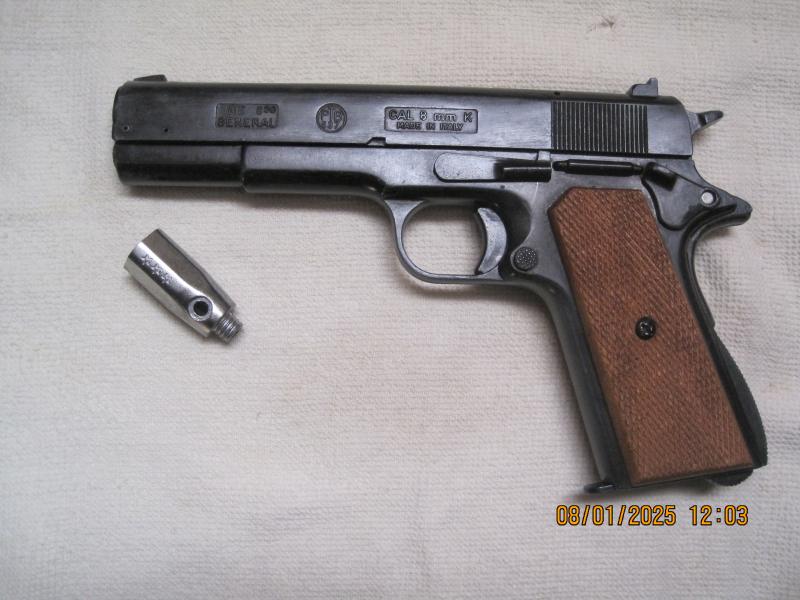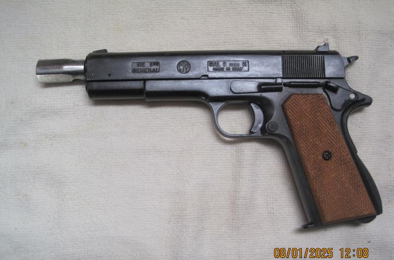 1ª ---- Pistola DETONADORA, marca ME 800 GENERAL, calibre 8 mm K, MADE IN ITALY .. réplica de la 1911, muy simple, la palanca de retenida no tiene otra función que retener la corredera manualmente, ya que cuando se dispara el último cartucho la recamara no queda abierta por la acción de esta palanca. El botón para extraer el cargador también es ficticio ya que realmente se saca por medio de otro botón/mecanismo que se halla debajo de la pistola por donde entra y sale el cargador, al igual que la palanca de seguro que es fija.