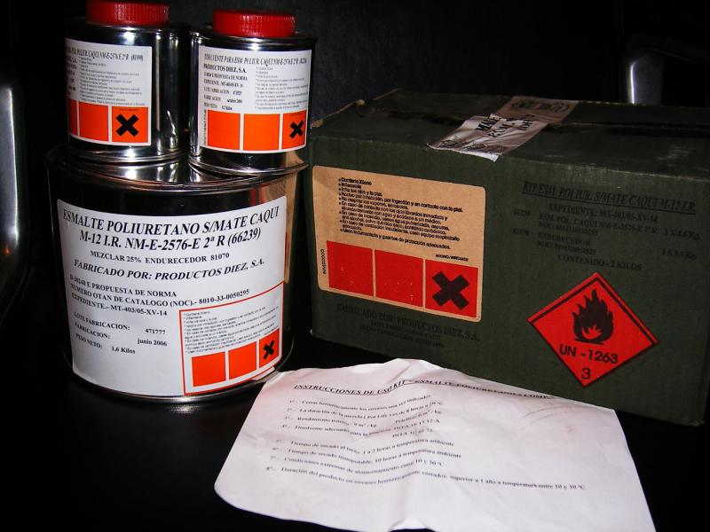 La compre en Mylitaria hace 2 semanas para pintar un jeep de mi propiedad y me sobraron 6 kits de kilo, de los cuales vendo 4 kg, no se han llegado a abrir y estan precintados, estan en las mismas condiciones que me lo mandaron, con total garantia del producto,ES UN PRODUCTO ORIGINAL MILITAR DISEÑADO PARA PINTAR ARMAS, VEHICULOS(TANQUES, AVIONES, BARCOS), ETC., PINTURA MILITAR DE GRAN RESISTENCIA, GARANTIZADO. PINTURA QUE EVITA REFLEJOS.