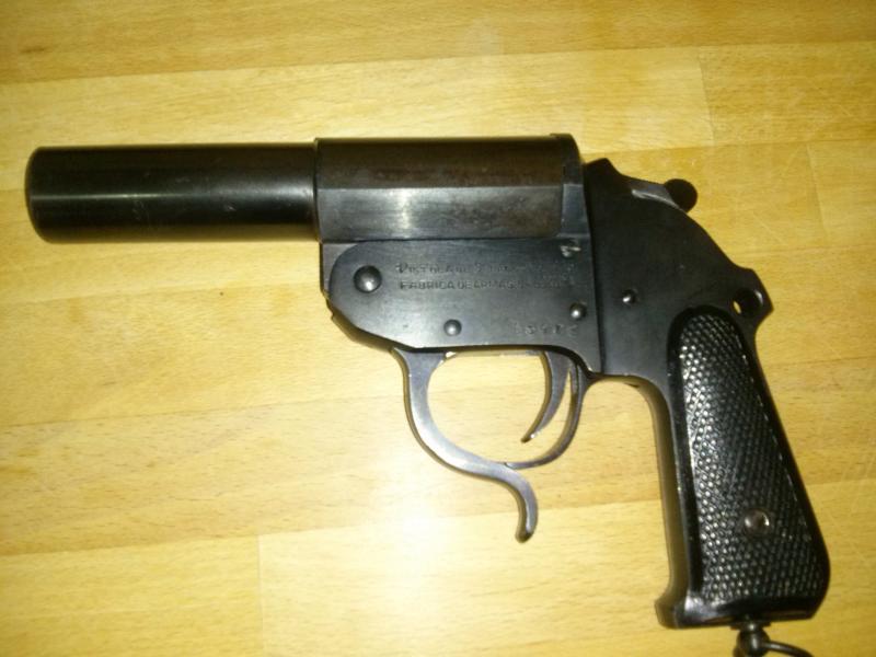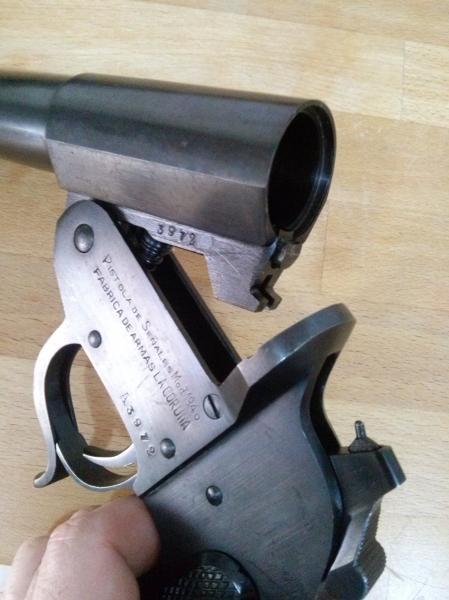 Vendo pistola de señales (o lanzabengalas, como se quiera decir) modelo Coruña, que fue reglamentaria en el ejercito español, en calibre 26,5mm en perfecto estado, con su pavón original, sin puntos de óxido, misma numeración, cahas perfectas...