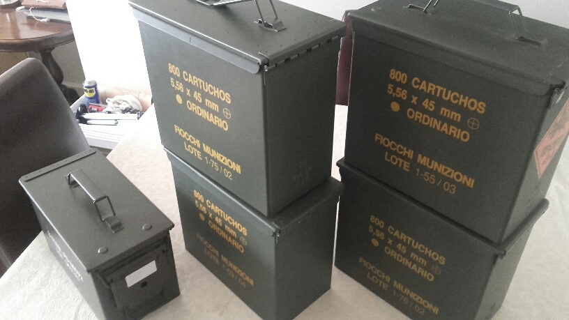 Vendo mis cajas de munición (vacías) del ejército español de 800 cartuchos calibre 5,56 de la marca Fiochi, son estancas y metálicas y están completamente nuevas.