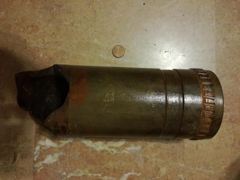 Proyectil de artilleria de la guerra civil. Tal y como se ve en la foto, no tiene ningún peligro ya que es solo hierro. Conserva restos de pintura naranja.