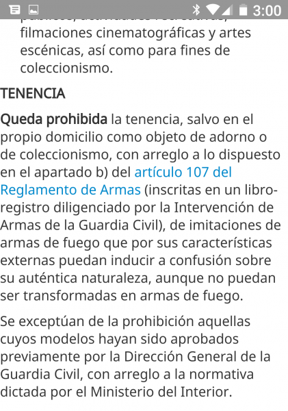 xesus60 escribió: Aunque en el presente Reglamento de Armas, en su Artículo 4, prohíbe esta clase de armas, el punto 2 del mismo dice textualmente: “No se considerará prohibida la tenencia de las armas relacionadas en el presente artículo por los museos, coleccionistas u organismos a que se refiere el artículo 107, con los requisitos y condiciones determinados en él”, haciendo referencia a que “se podrán poseer legalmente si las tienen inscritas en un Libro-Registro, diligenciado por la Intervención de Armas respectiva”.