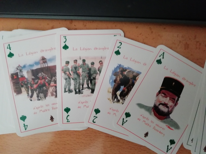Pongo a la venta una singular pieza de colección: un estuche de cuero original, con el emblema de la Legión Extranjera francesa y con sus colores (verde y rojo) que contiene un estuche de cartas francesas, con alegoría a la Legión Extranjera francesa; y, a su vez, otro juego de naipes españoles con alegorías a la Legión española.