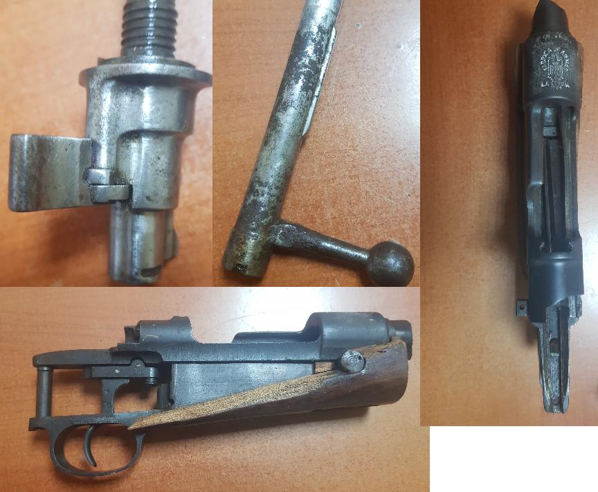 vendo almacén y cerrojo mauser coruña, es el cuerpo del cerrojo corte a 45 grados en la punta y la aguja cortada, cabeza de cerrojo con seguro en buen estado, almacén con gatillo incluido como se ve, 150 euros todo mas envió, está en Murcia.