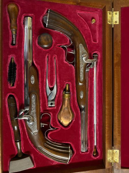 Pareja de pistolas de duelo muy utilizadas durante la segunda mitad del siglo XIX. Incorporan cañón acanalado, culata de Nogal bellamente talladas, disparador de pelo ajustable, alza regulable y punto de mira de hoja. En calibre 45 percusión. Estas pistolas se presentan en un elegante estuche de madera noble especialmente adaptado para estas dos pistolas, con sus correspondientes accesorios de carga. NO SE HAN DISPARADO NUNCA.
