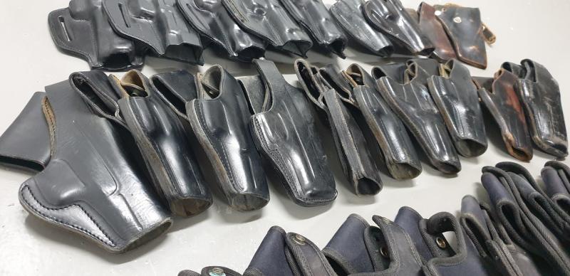 Lote de 27 fundas antiguas de revolver y pistola de servicio, más otras 5 fundas de defensa nuevas, provenientes de empresa de Seguridad Privada. Algunas incluso sin estrenar.