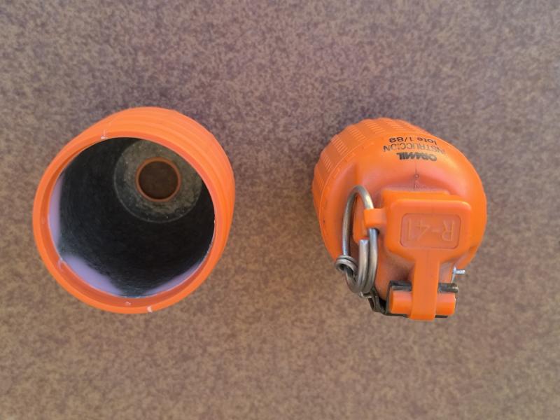 Se vende granada R-41 de Plasticas Oramil de instrucción, completamente inerte, junto con su vaso que la convierte en defensiva, en buen estado 60€ + portes. Rebajado 40€. REBAJADO A 30€