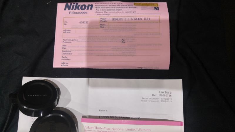 Visor Nikon 1.5-6x42 Reticula Iluminada, comprado a finales de Febrero de 2016.