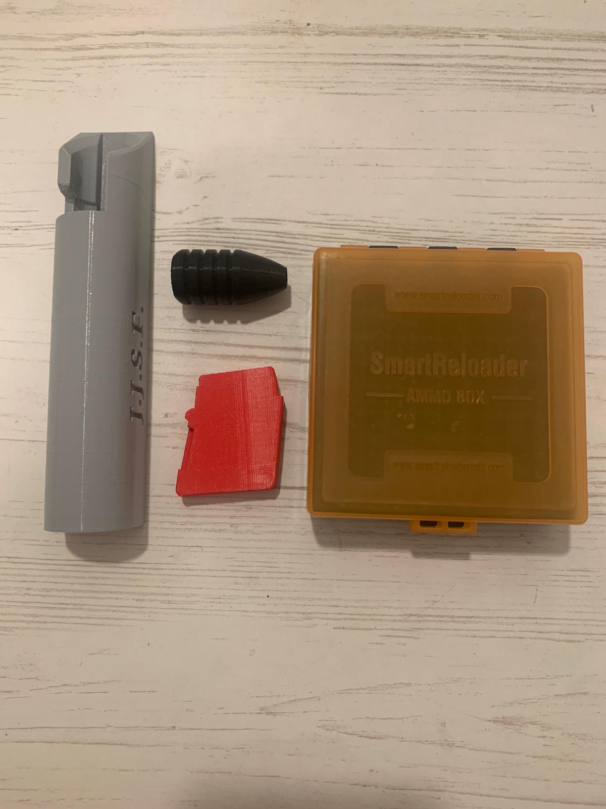 Cargador para convertirla en monotiro. (la parte inferior del cargador queda prácticamente a ras de la carabina), protector de cerrojo (problema, le puse mis iniciales para identificarla), pomo para el cerrojo y caja plástico SmartReloader para munición 22 lr (100 rondas).