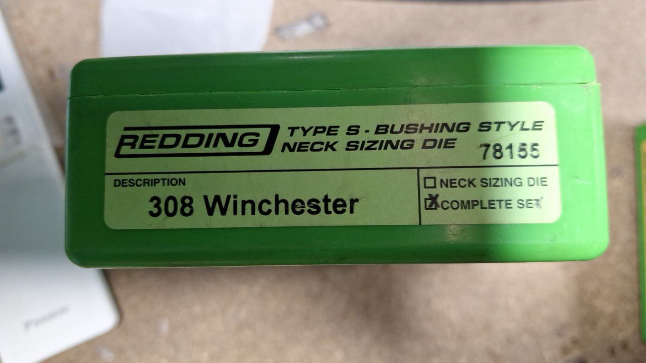 Die Redding cal.308 kit completo, incluye incluyen una matriz de dimensionamiento de cuello tipo S, una matriz de cuerpo y una matriz de asentamiento de bala.