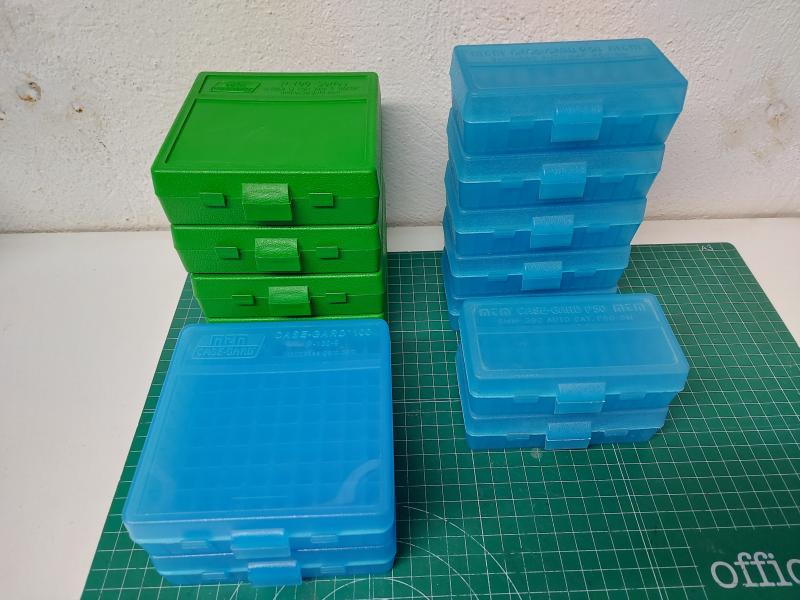 Vendo lote 13 cajas munición MTM Case-gard, 6 cajas P100-9 y 7 cajas P50-9, validas para los calibres 9 corto, 9 mm pb y .32 SW.
