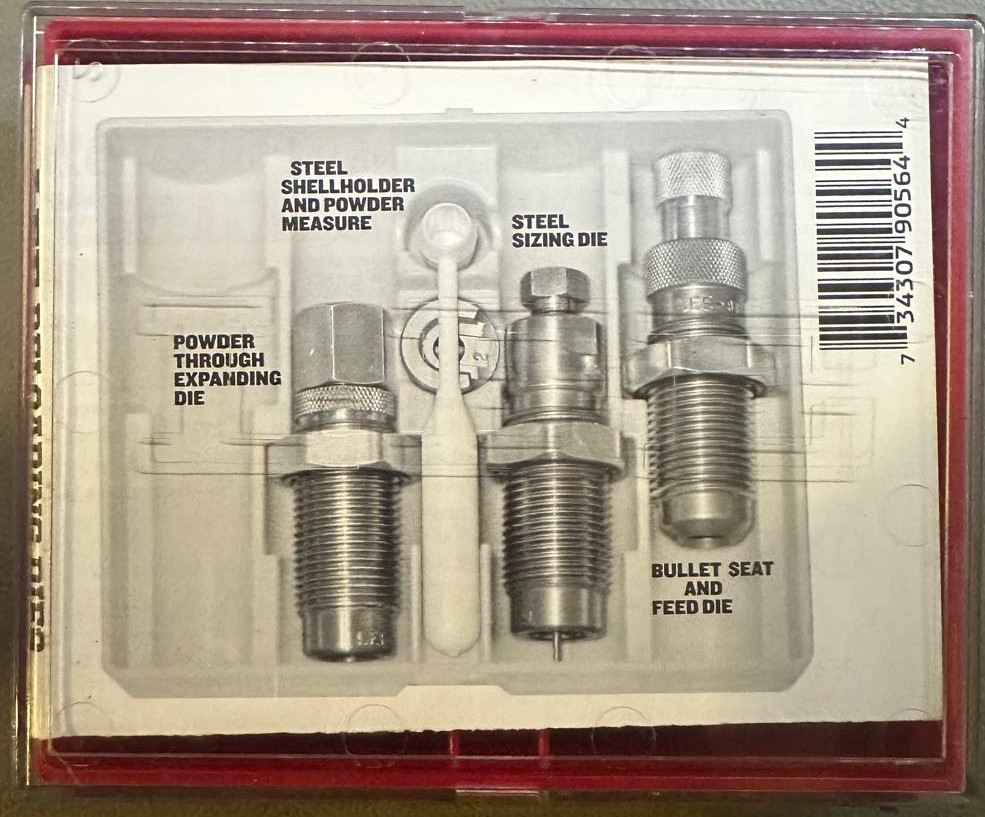 Set 3 dies. Desempistonador y recalibrar vaina, con anillo de carburo tungsteno, die abrir boca y dosificar pólvora y die posicionador de punta. Incluye amarra vainas monoestación para ese calibre y cacillo para pólvora.