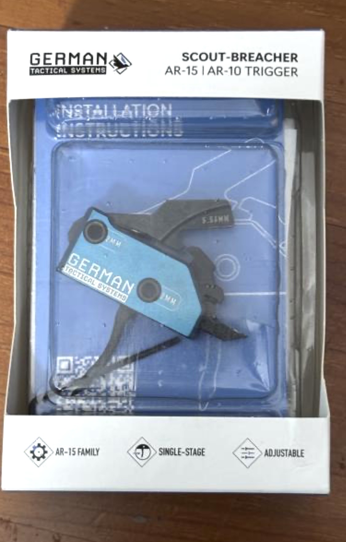 Se ofrece un kit de disparo Germán Tactical Systems de 3,5 Libras, 1.600 gramos de presión. El gatillo consta de parte curva y recta, la curva para tiro táctico, la recta para precision y disminuye la presión un poco. Disparo sin arrastre , para plataformas AR15.