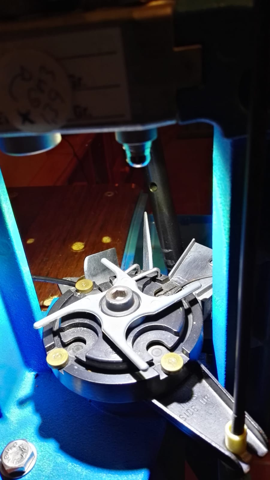 Ya tengo mi nueva luz instalada y funcionando en mi Dillon XL650, después de un pequeño susto inicial porque chocaba con el tornillo que sujeta el Shell plate y dejar una noche a Perdigacho sin dormir dándole vueltas a la cabeza pensando que había podido pasar, resultó que YO tenía mal colocado el alambre eyector de vainas y por ese motivo quedaba el tornillo un par de milímetros más alto. MIL PERDONES PERDIGACHO!!! En mi defensa diré que la máquina la acabo de comprar de segunda mano y venía mal montada. Bueno, hay que ver el lado positivo, después de varias llamadas ya tengo un nuevo amigo