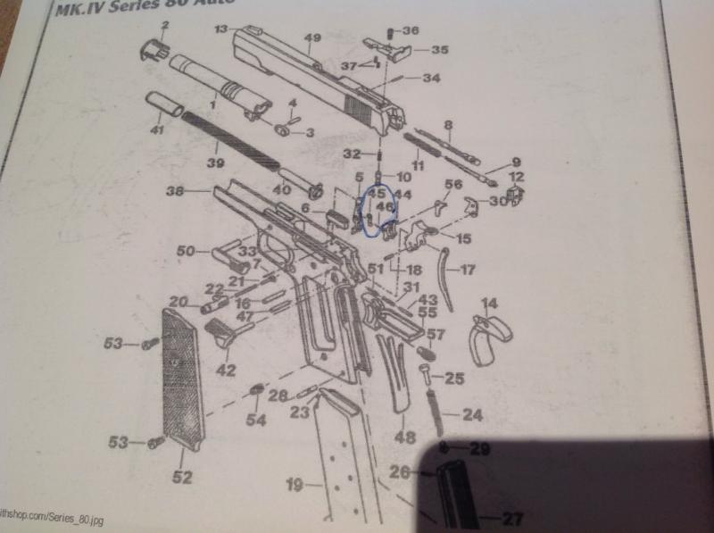 Hola amigos,a ver si alguien me pudede ayudar a encontrar estas piezas que por avatares de la vida se han extraviado ,se trata de el depresor y el muelle de una GOLD CUP series 80 del 45,si alguien las tuviera o me dijera donde comprarlas le estaría muy agradecido son la 45 y la 46,a continuación pongo unas fotos,saludos