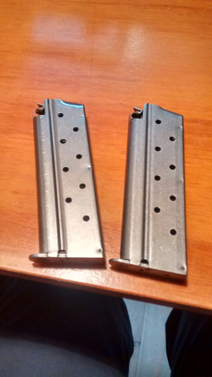 También 2 cargadores para pistola 1911 mono hilera, pero para pistola compacta, los compré por error para mi Trojan y no sirven, están sin estrenar.