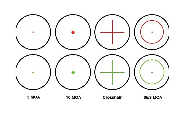 Estas son las 4 retículas intercambiables de este visor, tanto en color rojo, como en verde.