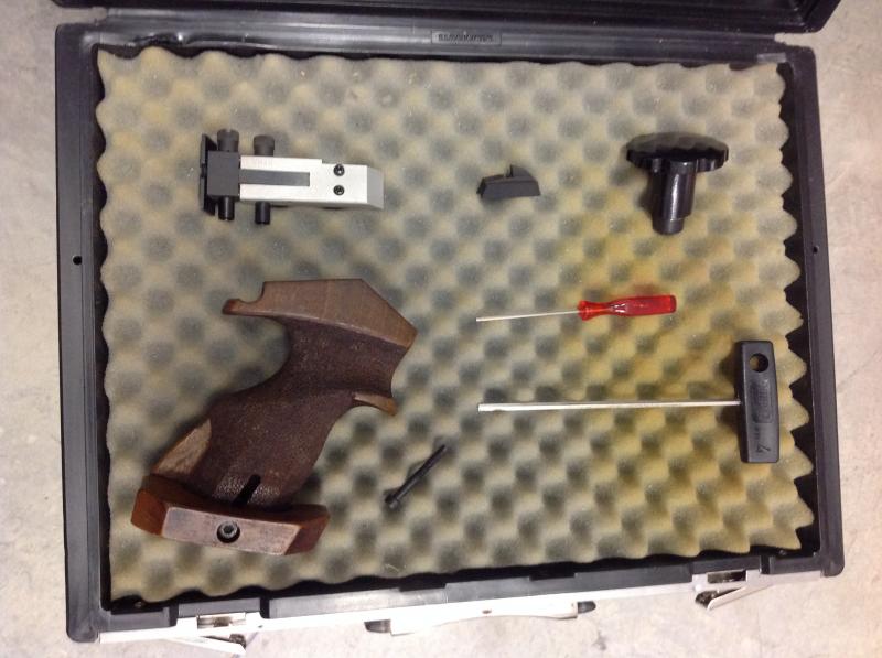 Se vende maletín, alza, punto de mira, empuñadura y las llaves que se ven en la foto (una de ellas es para cambiar las botellas de aire comprimido). Todo es Walther y no puedo asegurarlo pero creo que estaba todo montado en una CP-2.