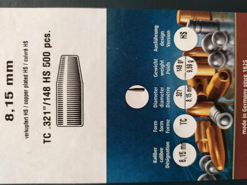 Se venden 500 puntas HN de 8mm , peso 148 grains (validas por ejemplo para el calibre 8x57). Se compraron por equivocación y están en su caja nueva. En las fotos aparecen las especificaciones de la punta.